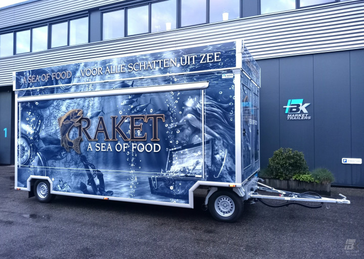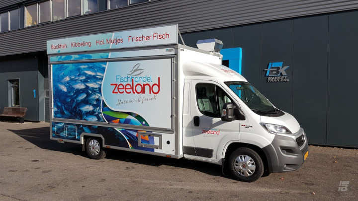 Onze partner Isidoro Signing heeft deze verkoopwagen aangekleed met mooie reclame en full colour bestickering. Ook het dakbord zorgt voor een extra reclamemogelijkheid. Over de gehele breedte kan de gekoelde toonbank naar buiten geschoven worden. De twee zijborden zijn voorzien van een doorkijk, waardoor de verkoopwagen een open uitstraling krijgt. De spots in de koof zijn speciaal geschikt voor visproducten, zodat het complete assortiment mooi naar voren komt.